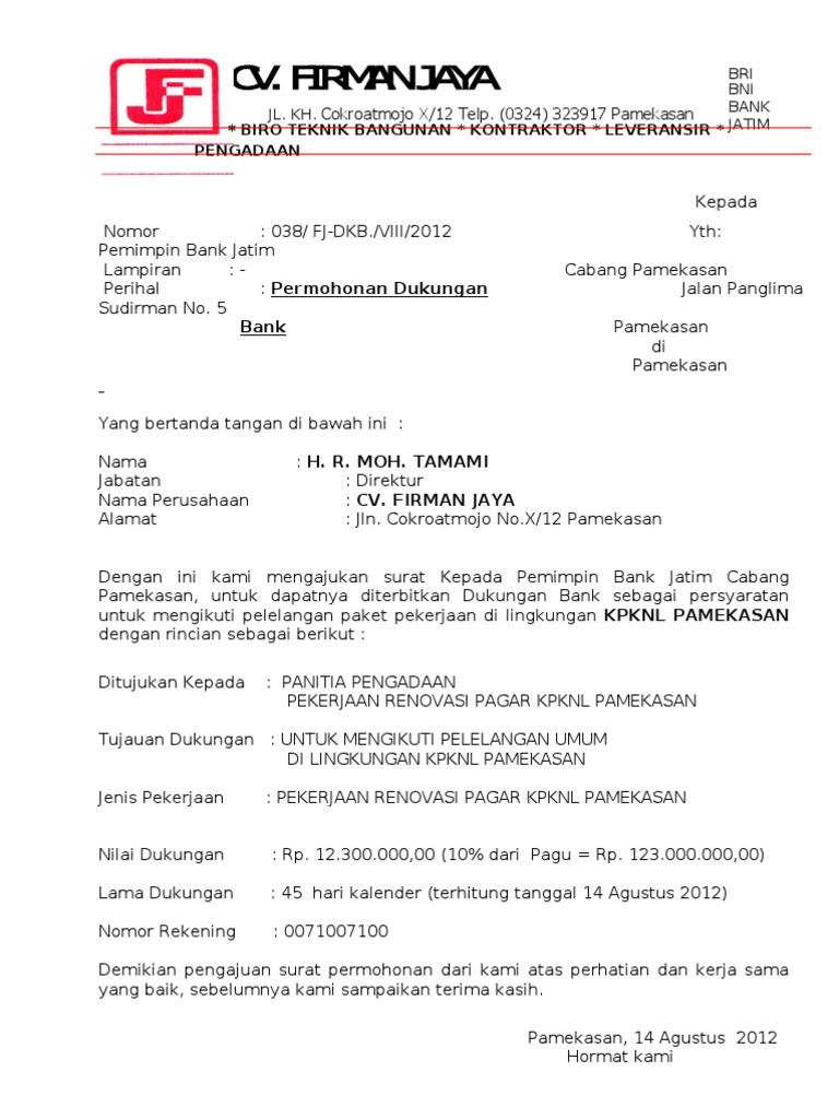 (1) kontrak (2) surat permintaan pembayaran dari rekanan (3) surat permohonan pembayaran dari unit kerja (4) kwitansi. 3.1 pembelian komputer yang dibenarkan adalah komputer peribadi (personal computer) yang mempunyai kemudahan multimedia ( a pair of speakers, sound card, cd rom drive). Surat permohonan adalah dokumen formal yang biasa digunakan seseorang untuk mengajukan kepentingan jenis surat permohonan terbilang beragam. 6 contoh surat pernyataan kesanggupan paling fresh 2018. Demikian surat permohonan rekanan dari kami, atas kerjasamanya yang baik kami ucapkan terima kasih.